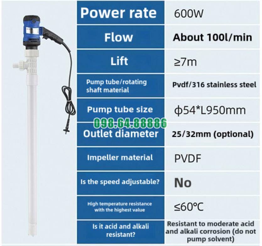 Máy bơm thùng phuy cắm điện JDT-600W-PVDF sử dụng động cơ điện công suất 600W, hoạt động tốt nhất ở nguồn điện xoay chiều 220V – 50Hz.
