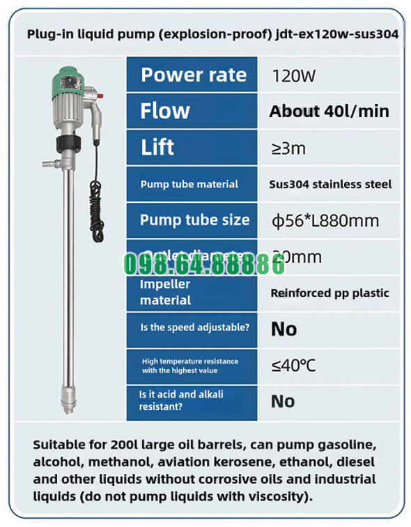 Phạm vi ứng dụng rộng rãi của Bơm chất lỏng cắm điện chống cháy nổ JDT-EX120W-SUS304 còn bao gồm các nhà máy sản xuất, nơi cần sang chiết chất lỏng thường xuyên.