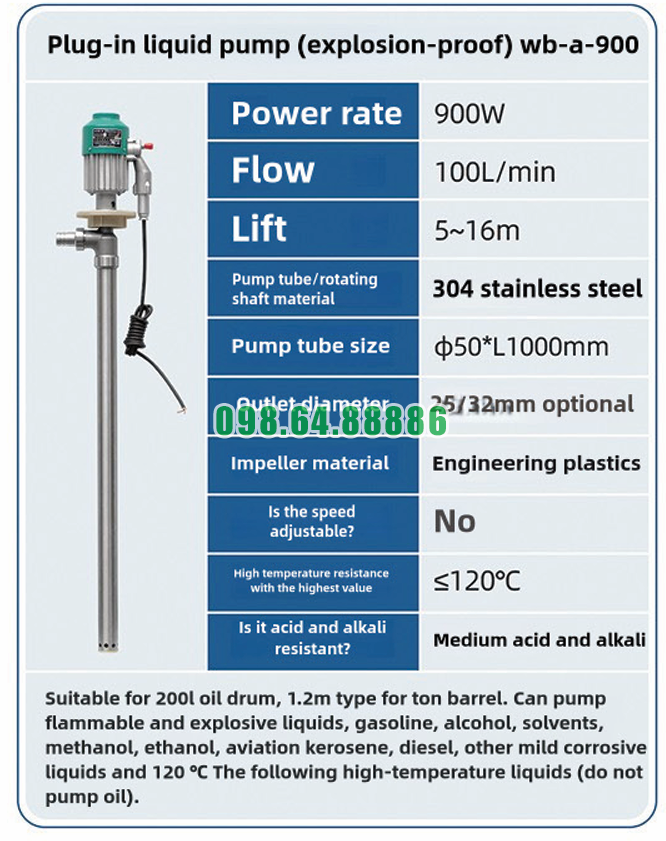 Chi tiết các bộ phận cấu thành nên Máy bơm chất lỏng cắm trực tiếp chống cháy nổ WB-A-900 cho thấy sự kết hợp chặt chẽ giữa động cơ mạnh mẽ, vật liệu bền bỉ và thiết kế tối ưu. Mỗi bộ phận đều đóng vai trò riêng biệt nhưng cùng hướng đến mục tiêu đảm bảo hiệu suất cao, vận hành ổn định và an toàn trong môi trường công nghiệp đặc thù.