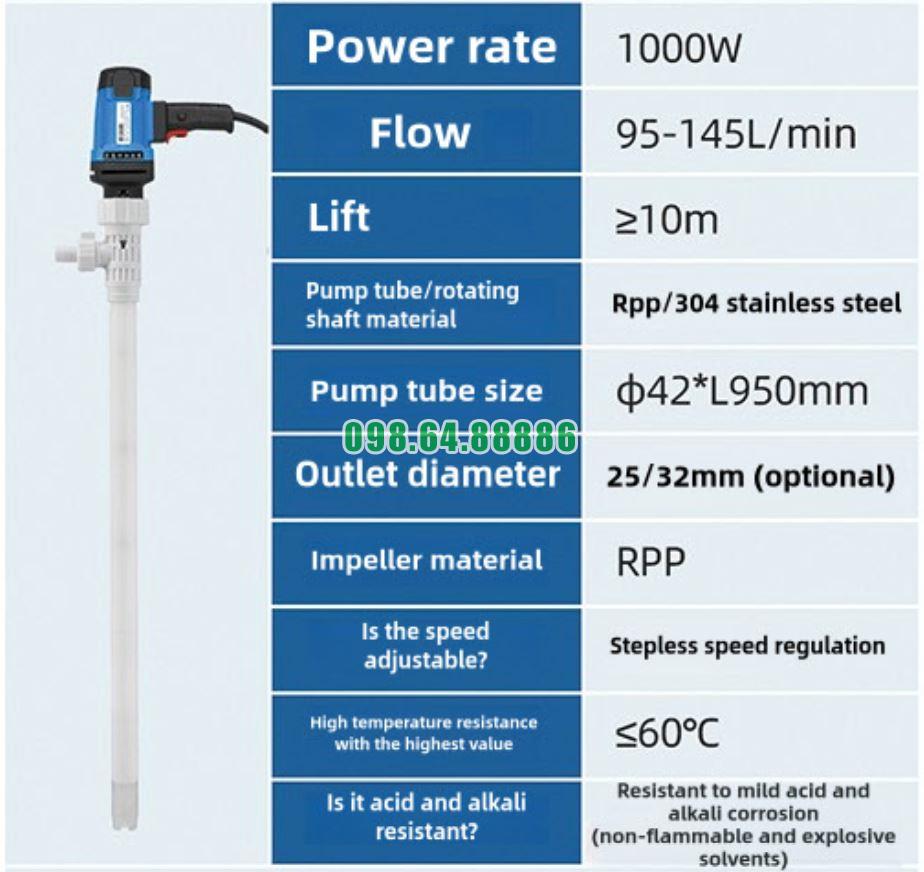 Nhờ sự kết hợp giữa vật liệu chịu nhiệt và thiết kế tách nhiệt hợp lý, bơm cắm điện thùng phuy model JDT-1000W-PVDF có thể vận hành liên tục trong thời gian dài mà không xảy ra hiện tượng quá nhiệt nếu sử dụng đúng điều kiện kỹ thuật.