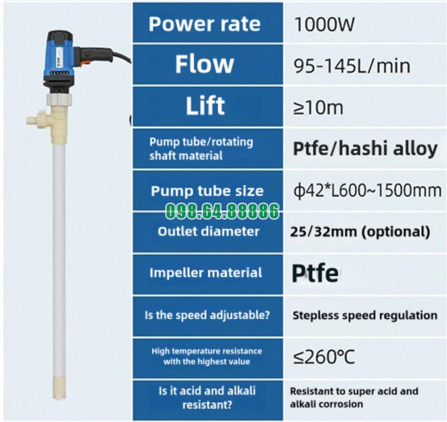 Hóa chất tẩy rửa đậm đặc thường có tính ăn mòn cao, độ hoạt hóa mạnh và độ nhớt lớn hơn dung dịch thông thường. Việc bơm và trung chuyển các loại hóa chất này đòi hỏi thiết bị có khả năng chịu ăn mòn tốt, dòng chảy ổn định và vận hành an toàn. Bơm điện nhúng thùng phuy hóa chất chống ăn mòn model JDT-1000W-PTFE được thiết kế phù hợp cho ứng dụng bơm hóa chất tẩy rửa đậm đặc từ thùng phuy.