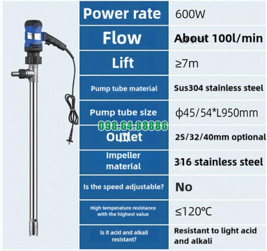 Bơm hút thùng phuy dùng cho hóa chất JDT-600-RPP