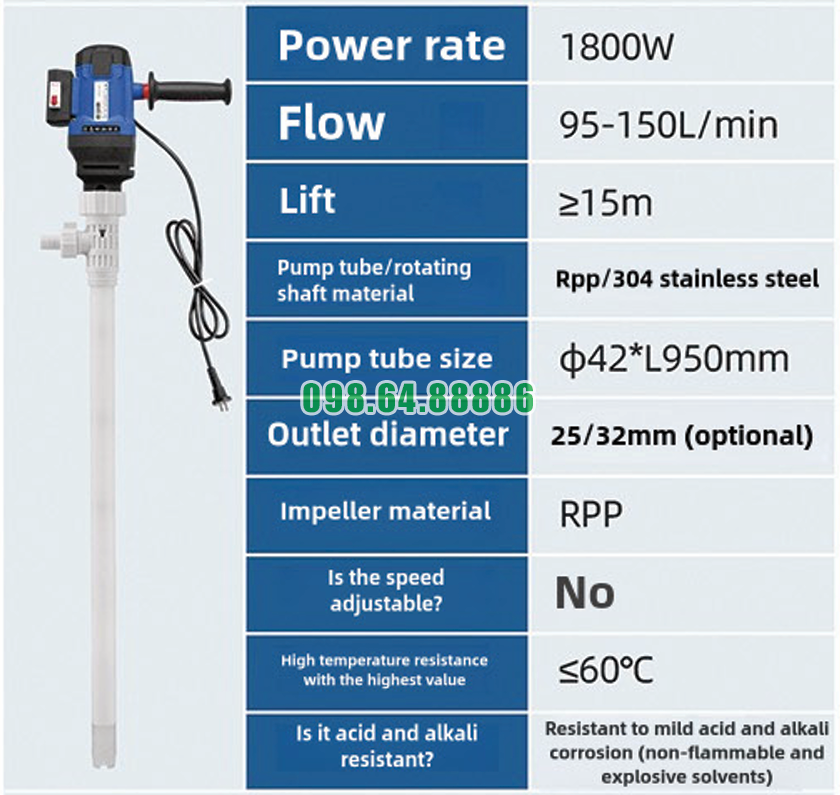 Nhờ công suất động cơ 1800W, thiết bị có thể đạt lưu lượng từ 95 đến 150 L/phút. Lưu lượng lớn giúp quá trình bơm và chiết rót chất lỏng diễn ra nhanh hơn so với nhiều loại bơm công suất thấp.