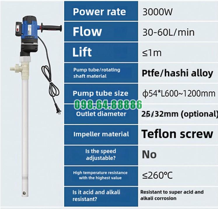 Máy bơm hút thùng phuy hóa chất JDT-3000W-PTFELG