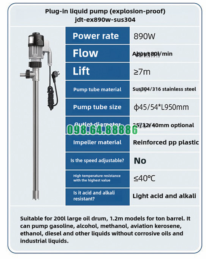 Máy bơm chất lỏng cắm trực tiếp chống cháy nổ JDT-EX890W-SUS304 là lựa chọn hàng đầu cho doanh nghiệp