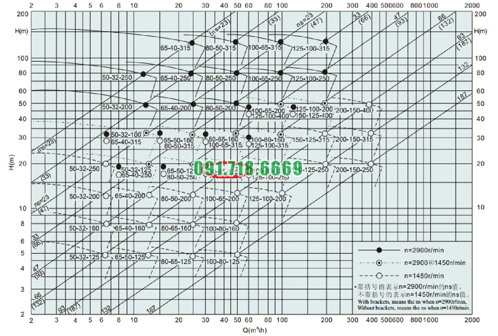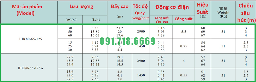 Bảng lưu lượng của máy bơm nước cánh hở IHK80-65-125 đường thoát đầu vào ra Dn80