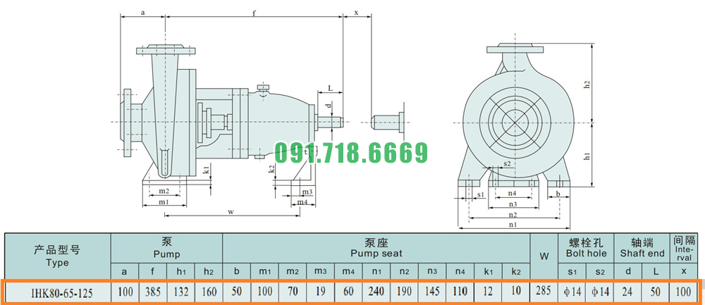 Kích thước lắp đặt của máy bơm nước cánh hở IHK80-65-125 đường thoát đầu vào ra Dn80