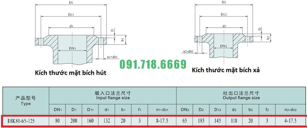 Kích thước mặt bích của máy bơm nước cánh hở IHK80-65-125 đường thoát đầu vào ra Dn80