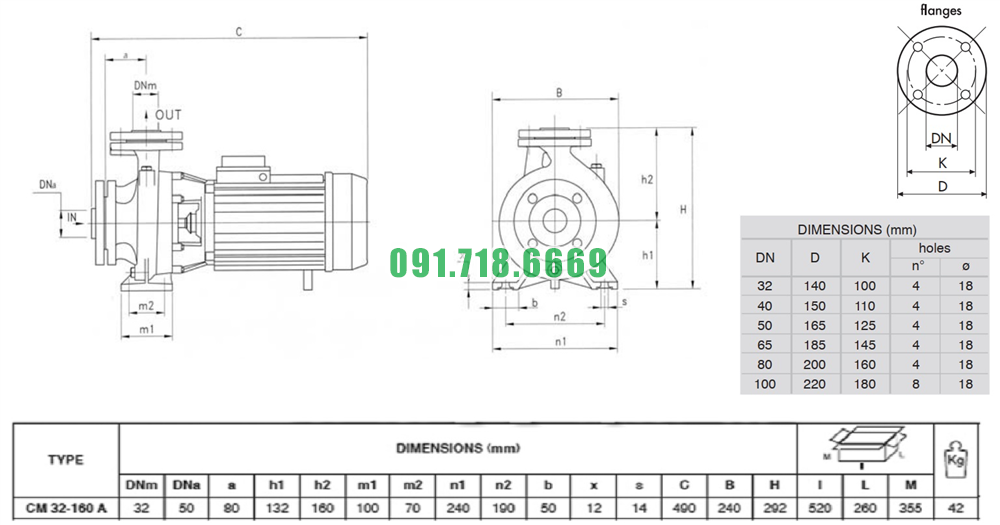 Kích thước máy bơm nước li tâm CM32-200C đường thoát đầu vào ra DN50