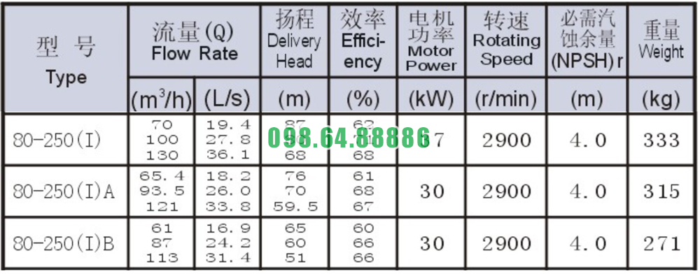 Bảng thông số kỹ thuật bơm li tâm trục ngang SLW80-ISW80-250-I lưu lượng 36.1 L/s hoặc 130 m3/h