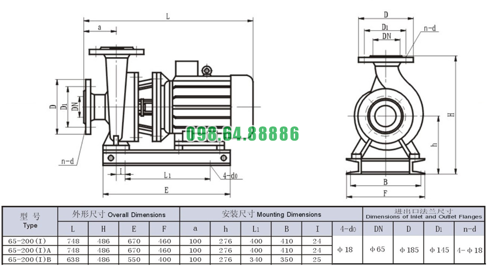 Bản vẽ cấu tạo và kích thước bơm nước nằm ngang mã SLW65-ISW65-200-I động cơ 15 kw