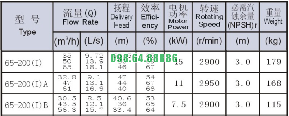 Bảng thông số kỹ thuật bơm nước nằm ngang mã SLW65-ISW65-200-I động cơ 15 kw