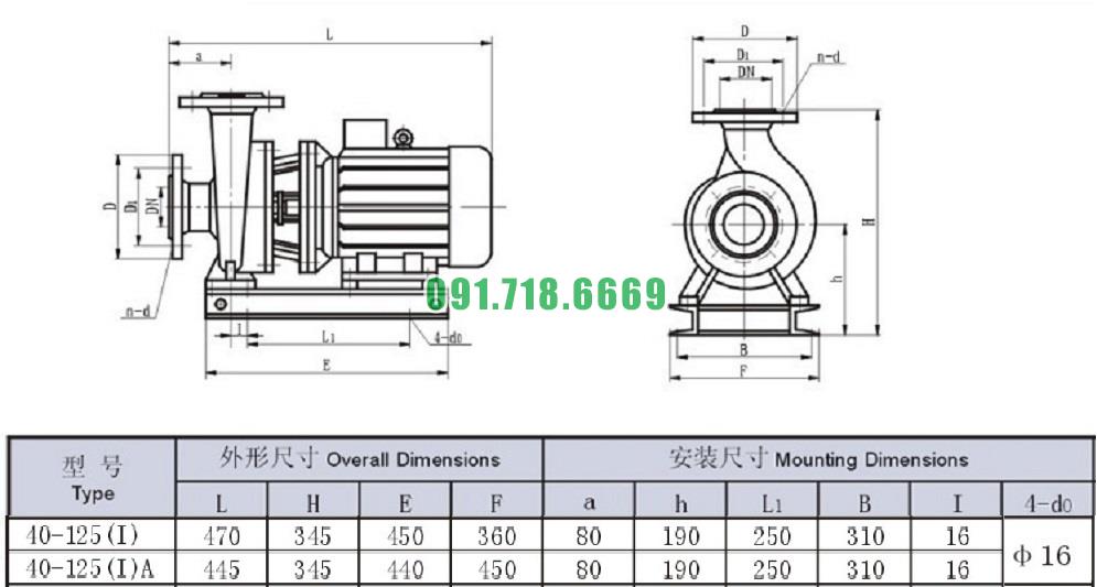 Bản vẽ cấu tạo và kích thước bơm nước nằm ngang SLW-ISW40-125-I lưu lượng từ 2.44 L/s - 4.53 L/s