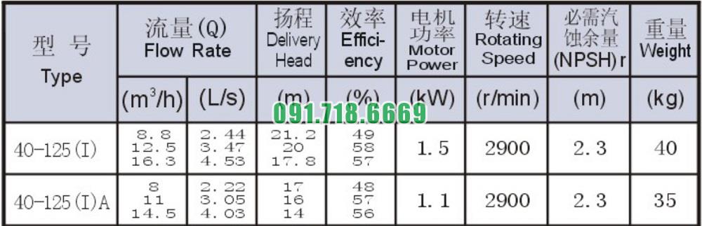 Bảng thông số kỹ thuật bơm nước nằm ngang SLW-ISW40-125-I lưu lượng từ 2.44 L/s - 4.53 L/s