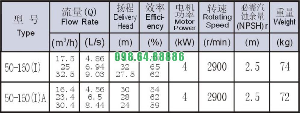 Bảng thông số kỹ thuật bơm nước nằm ngang SLW-ISW50-160-I năng suất từ 54% - 65%