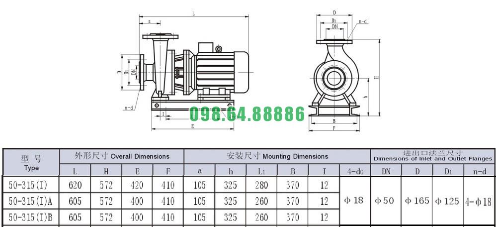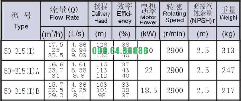 Bảng thông số kỹ thuật bơm nước nằm ngang SLW-ISW50-315-I công suất 30 kw