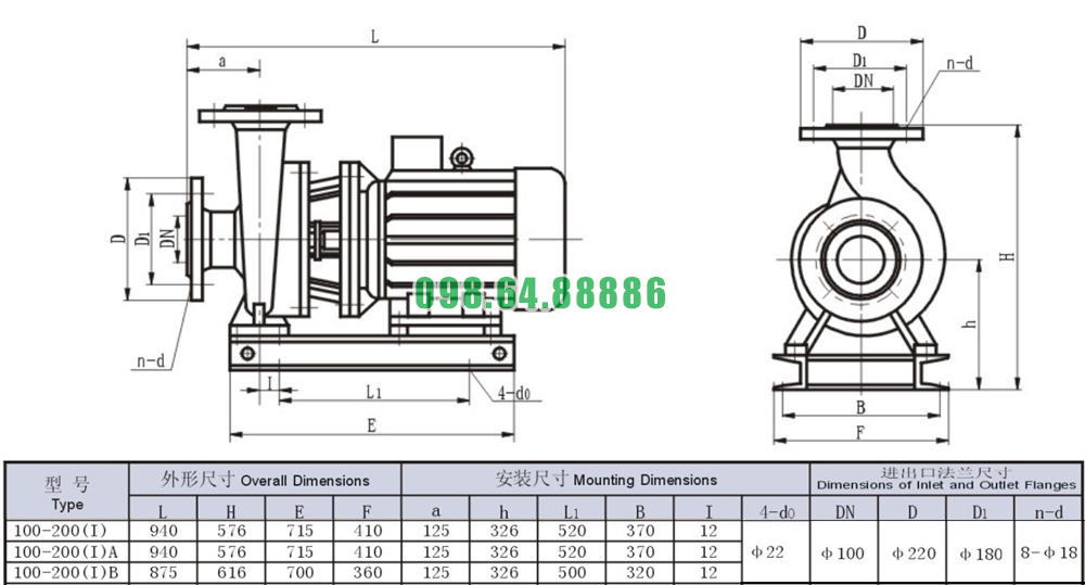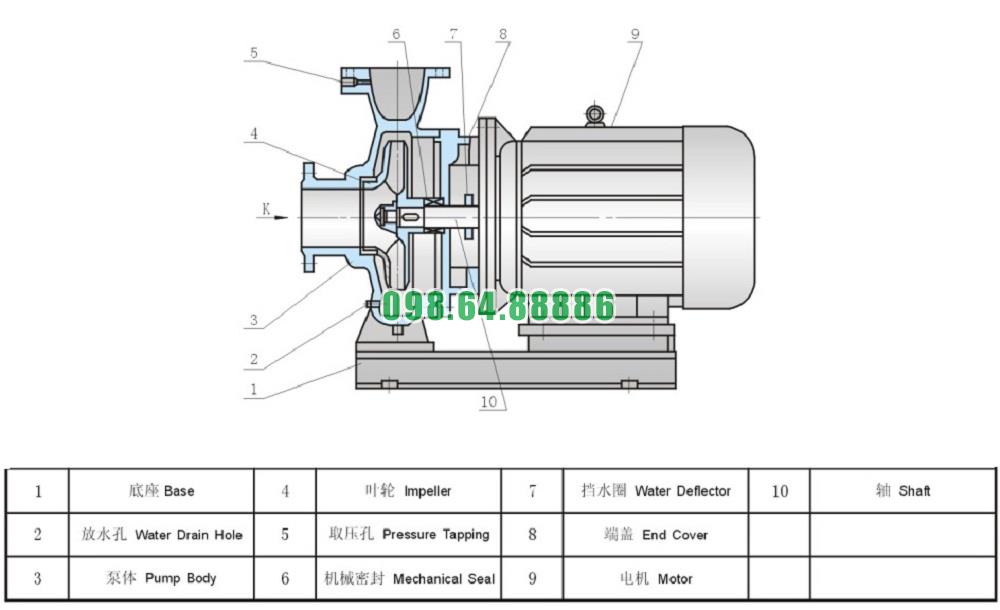 Bản vẽ cấu tạo và kích thước bơm nước nằm ngang SLW100-ISW100-200-I độ hút sâu 4.0m