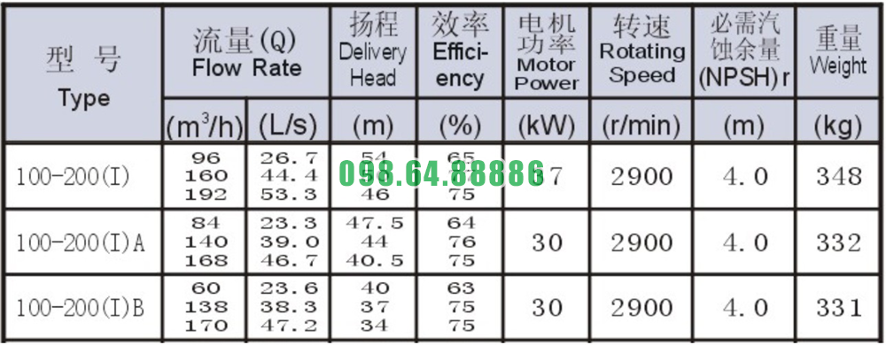 Bảng thông số kỹ thuật bơm nước nằm ngang SLW100-ISW100-200-I độ hút sâu 4.0m
