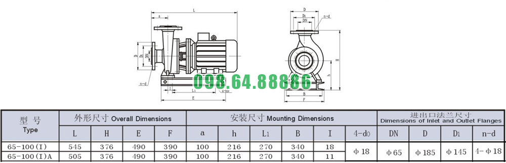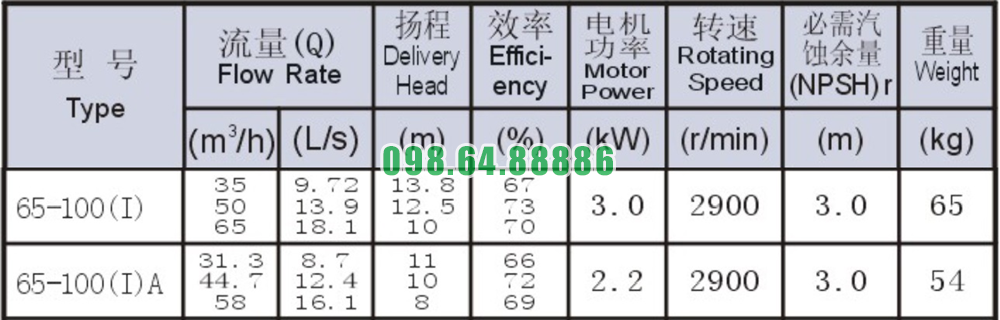 Bảng thông số kỹ thuật bơm nước nằm ngang SLW65-ISW65-100-I năng suất từ 67% - 73%