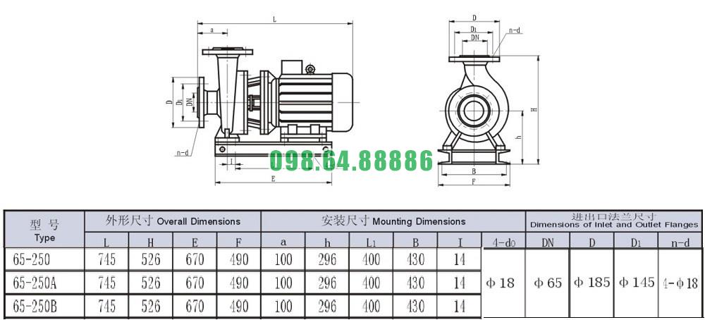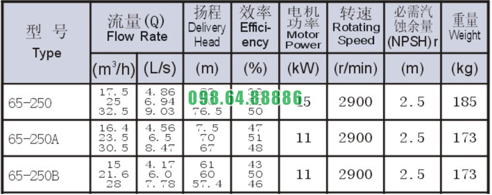 Bảng thông số kỹ thuật bơm nước nằm ngang SLW65-ISW65-250 vòng quay 2900 r/min