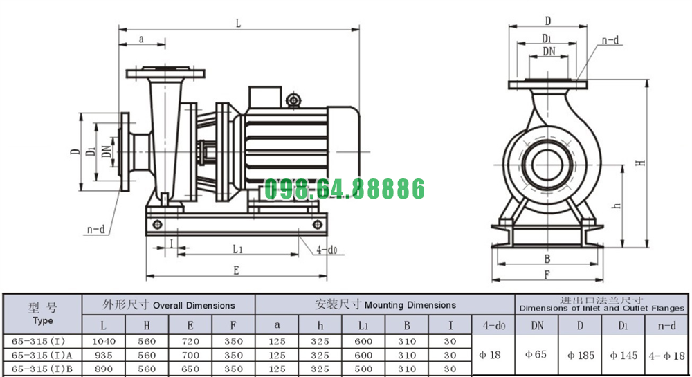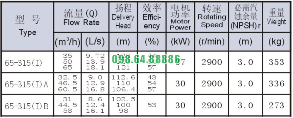 Bảng thông số kỹ thuật bơm nước nằm ngang SLW65-ISW65-315-I vòng quay 2900 r/min