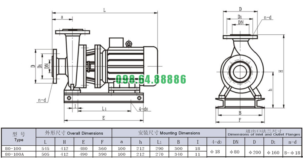 Bản vẽ cấu tạo và kích thước bơm nước nằm ngang SLW80-ISW80-100 năng suất từ 67% - 73%