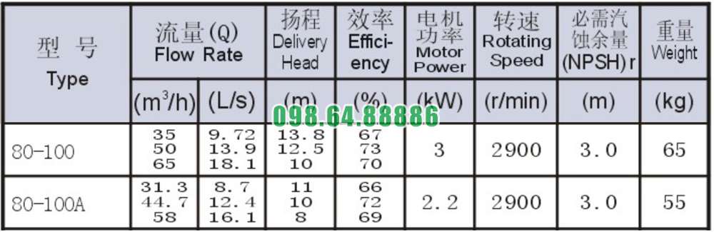 Bảng thông số kỹ thuật bơm nước nằm ngang SLW80-ISW80-100 năng suất từ 67% - 73%