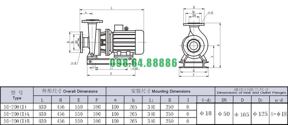Bản vẽ cấu tạo và kích thước bơm nước trục ngang SLW-ISW50-200-I tốc độ quay 2900 r/min