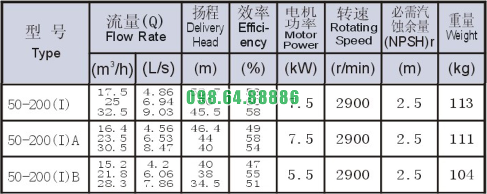 Bảng thông số kỹ thuật bơm nước trục ngang SLW-ISW50-200-I tốc độ quay 2900 r/min