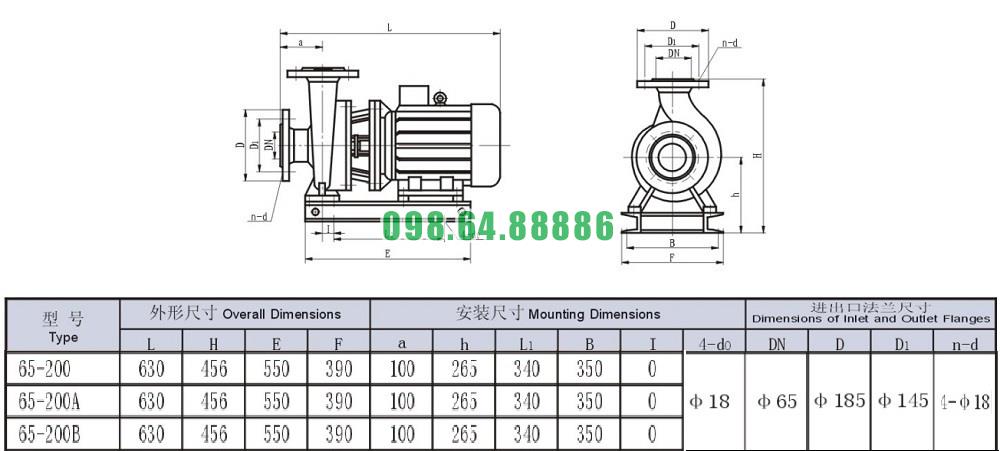 Bản vẽ cấu tạo và kích thước bơm nước trục ngang SLW-ISW65-200 khối lượng 110 kg