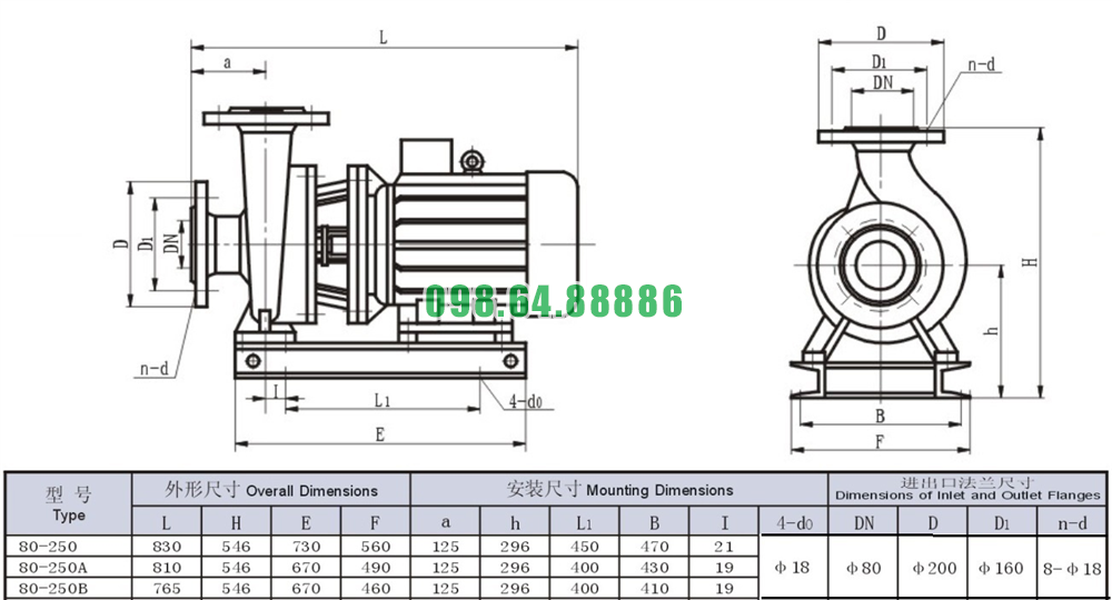 Bản vẽ cấu tạo và kích thước bơm nước trục ngang SLW80-ISW80-250 đẩy cao max 83m