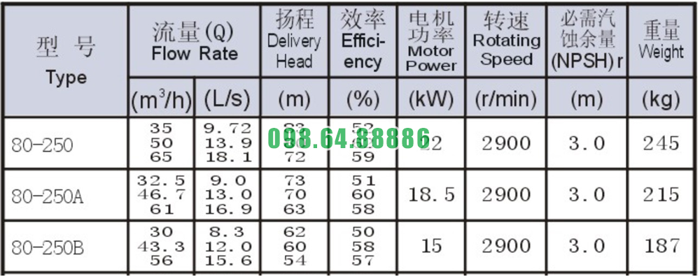 Bảng thông số kỹ thuật bơm nước trục ngang SLW80-ISW80-250 đẩy cao max 83m