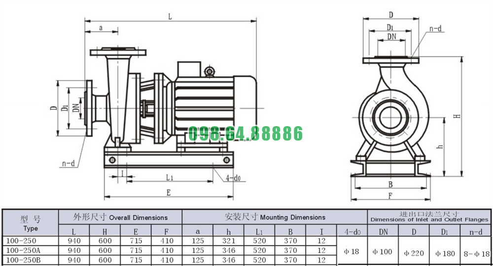 Bản vẽ cấu tạo và kích thước bơm nước trục ngang model SLW100-ISW100-250 hiệu suất max 130 m3/h