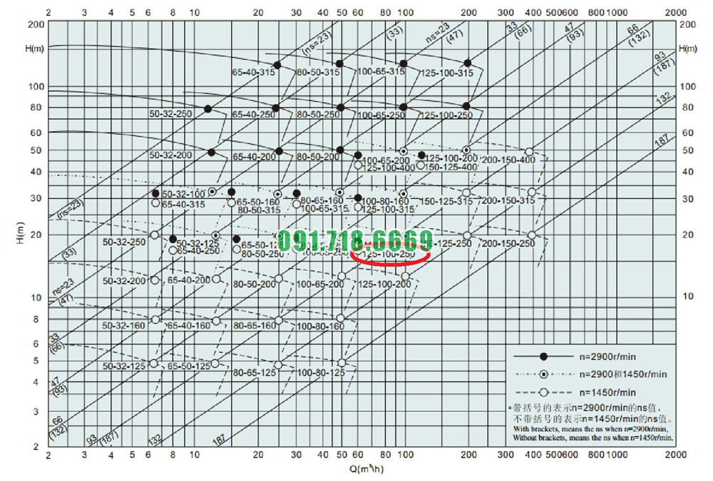 Bảng lưu lượng của máy bơm nước li tâm cánh hở IHK125-100-250 động cơ điện 75 kw