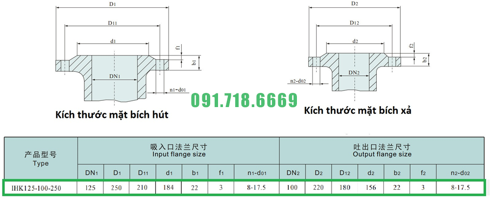 Kích thước mặt bích của máy bơm nước li tâm cánh hở IHK125-100-250 động cơ điện 75 kw