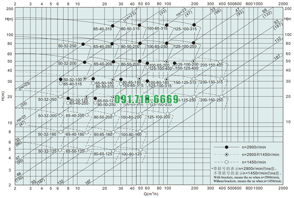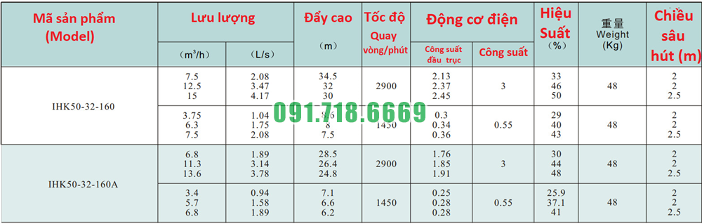 Bảng thông số lưu lượng của máy bơm nước li tâm cánh hở IHK50-32-160 động cơ điện 3 kw