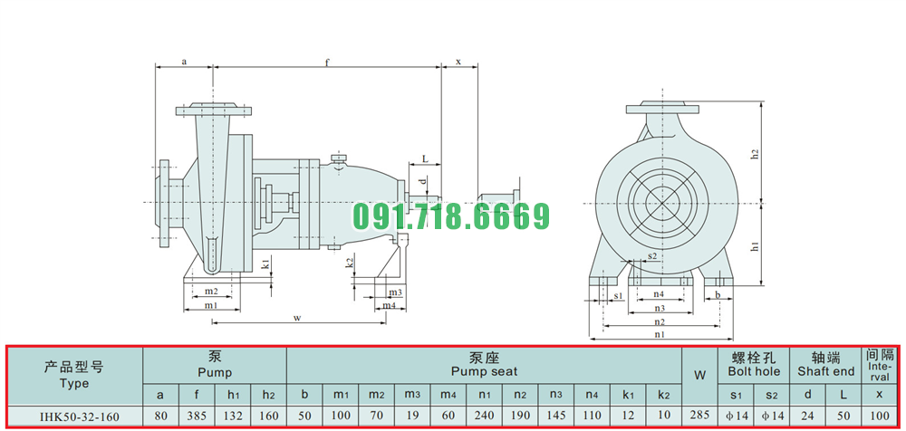 Kích thước lắp đặt của đầu bơm máy bơm nước li tâm cánh hở IHK50-32-160 động cơ điện 3 kw