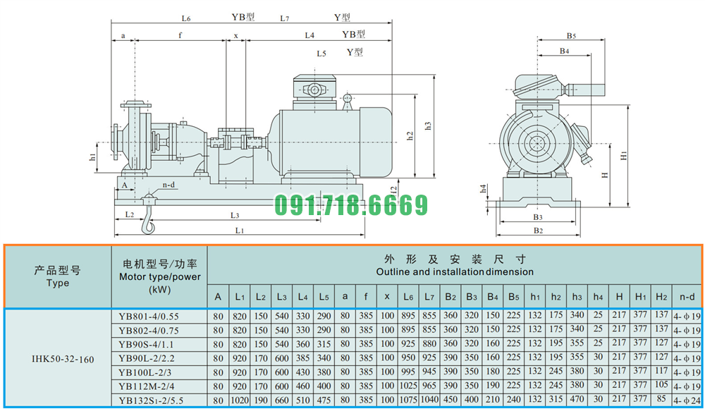 Kích thước của máy bơm nước li tâm cánh hở IHK50-32-160 động cơ điện 3 kw