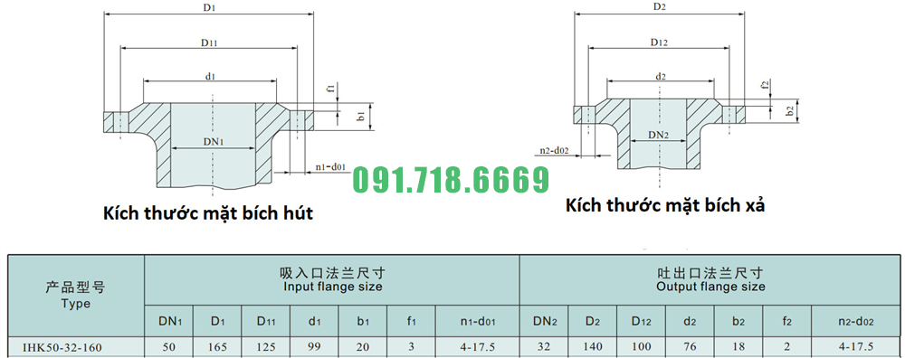 Kích thước mặt bích kết nối hút xả của máy bơm nước li tâm cánh hở IHK50-32-160 động cơ điện 3 kw