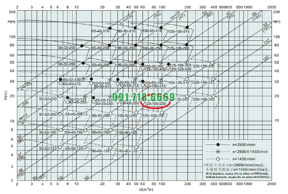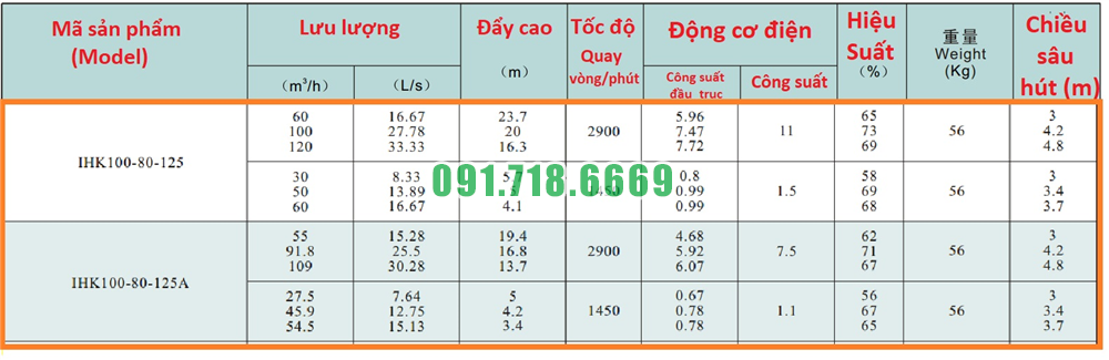 Bảng lưu lượng của máy bơm nước sạch cánh hở IHK100-80-125 vỏ bằng inox 316L