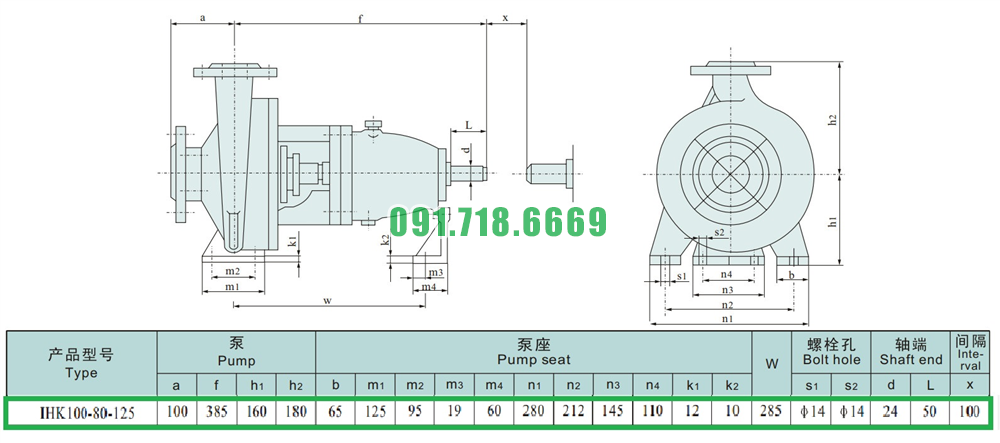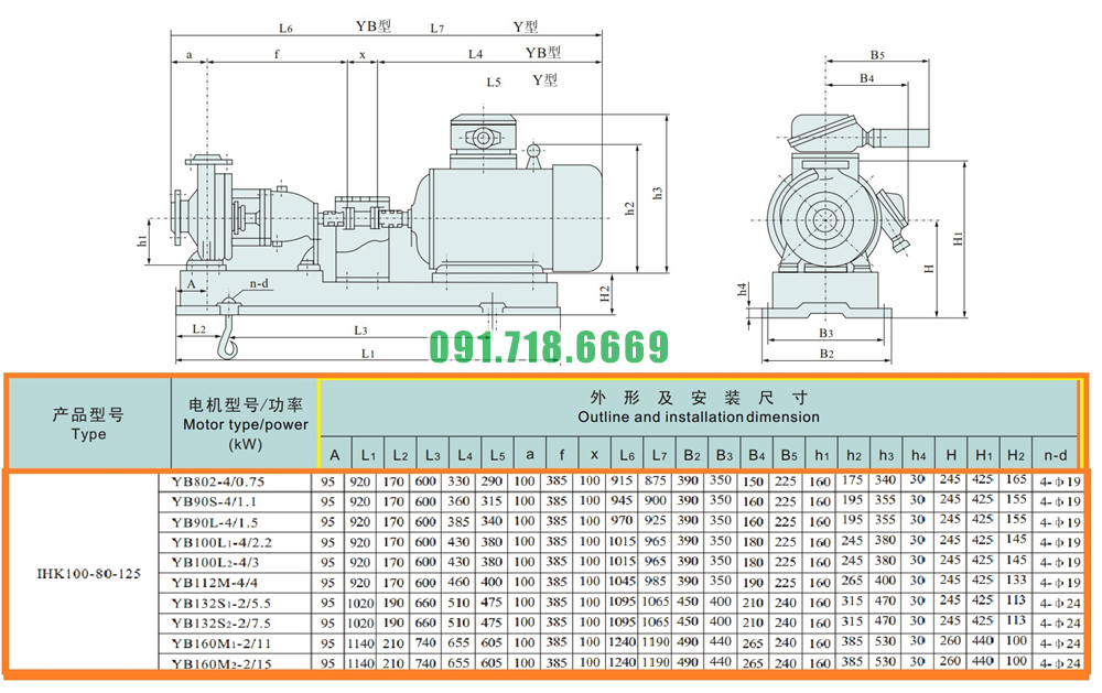 Kích thước lắp đặt của máy bơm nước sạch cánh hở IHK100-80-125 vỏ bằng inox 316L