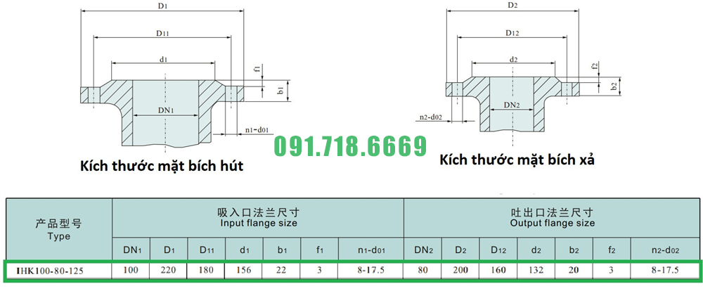 Kích thước mặt bích của máy bơm nước sạch cánh hở IHK100-80-125 vỏ bằng inox 316L