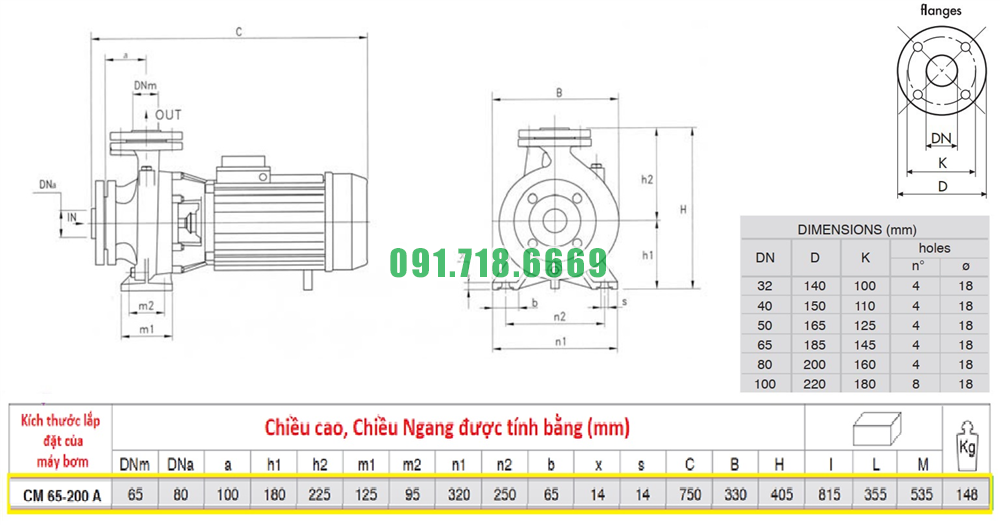 Kích thước máy bơm nước sạch li tâm CM65-200A hiệu suất 144 m3/h
