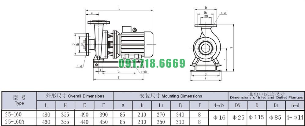 Bản vẽ cấu tạo và kích thước bơm nước trục ngang ISW25-160 độngg cơ 1.5 kw lưu lượng 5.2 m3/h