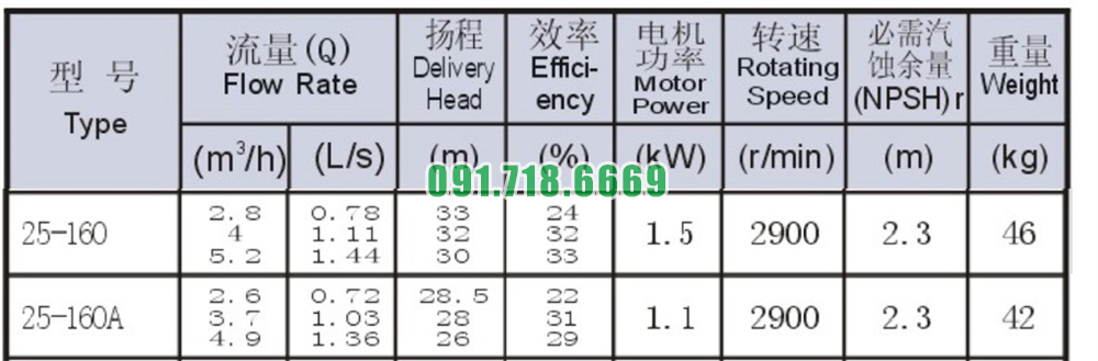 Bảng thông số kỹ thuật bơm nước trục ngang ISW25-160 độngg cơ 1.5 kw lưu lượng 5.2 m3/h