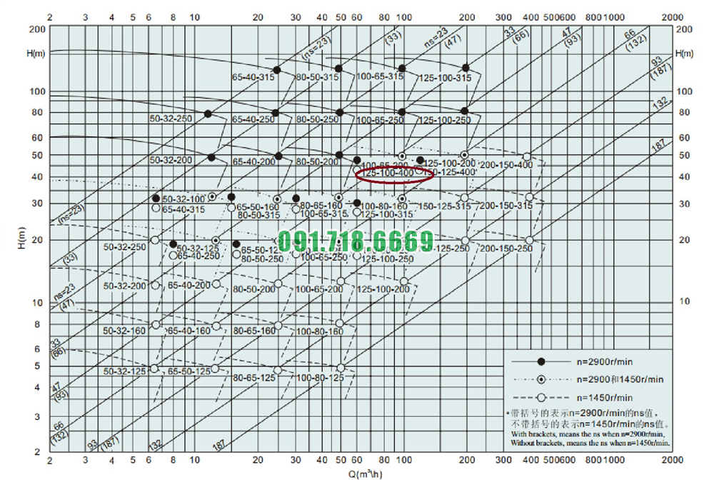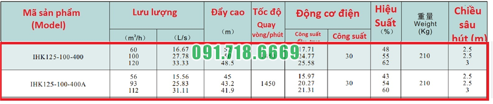 Bảng lưu lượng của máy bơm cánh hở li tâm trục ngang IHK125-100-400 lưu lượng 120 m3/h