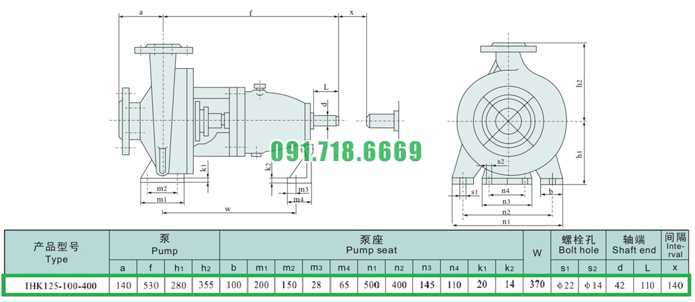 Kích thước của đầu máy bơm cánh hở li tâm trục ngang IHK125-100-400 lưu lượng 120 m3/h