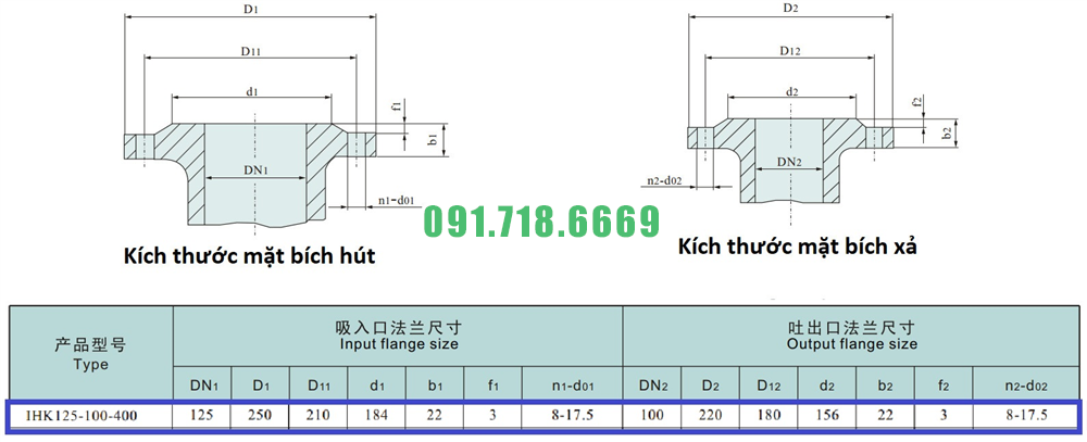 Kích thước mặt bích của máy bơm cánh hở li tâm trục ngang IHK125-100-400 lưu lượng 120 m3/h