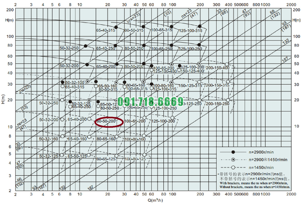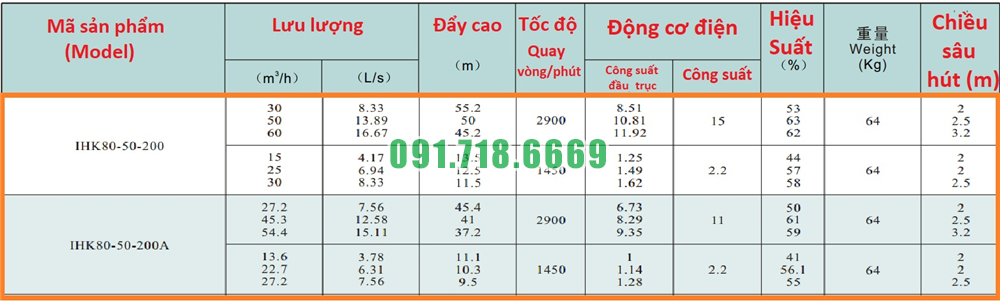 Bảng lưu lượng của máy bơm cánh hở li tâm trục ngang IHK80-50-200 đường thoát 50 mm