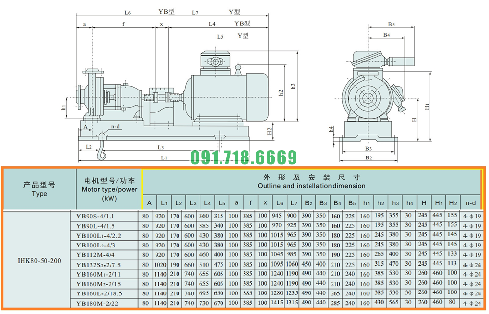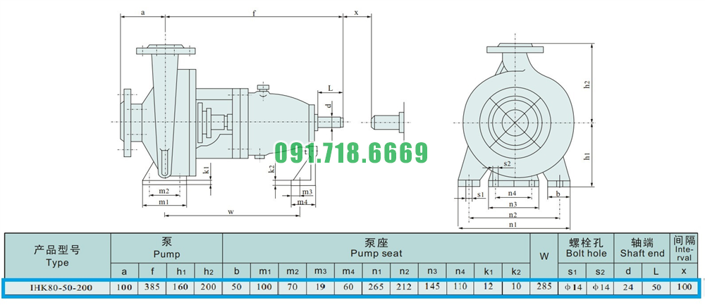 Kích thước của đầu máy bơm cánh hở li tâm trục ngang IHK80-50-200 đường thoát 50 mm